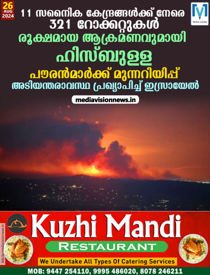ഇസ്രായേലിനെതിരായ ആദ്യഘട്ട ആക്രമണം പൂര്ത്തിയാക്കിയെന്ന് ഹിസ്ബുള്ള അറിയിച്ചു. 11 ഇസ്രായേലി സൈനിക കേന്ദ്രങ്ങള്ക്ക് നേരെ 321 റോക്കറ്റുകള് തൊടുത്തുവെന്ന് ഹിസ്ബുള്ള അറിയിച്ചു. ആക്രമണങ്ങളെ തുടര്ന്ന് 48 മണിക്കൂര് സമയത്തേക്ക് ഇസ്രായേല് അടിയന്തരാവസ്ഥ പ്രഖ്യാപിച്ചു.