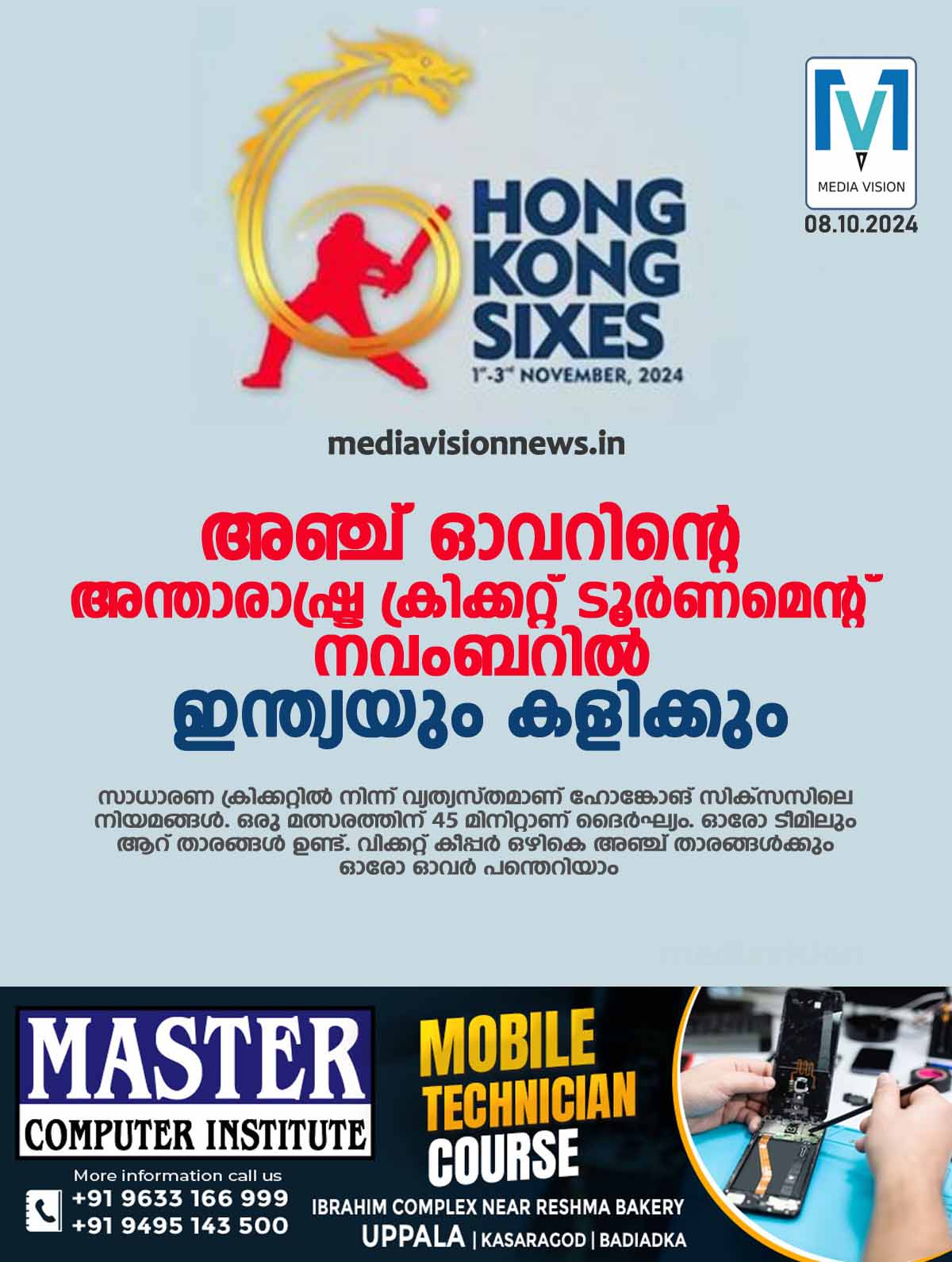ഏഴ് വർഷത്തിന്റെ ഇടവേളയ്ക്ക് ശേഷം ഹോങ്കോങ് ക്രിക്കറ്റ് സിക്സസ് തിരിച്ചുവരുന്നു. അഞ്ച് ഓവറാണ് ഈ ടൂർണമെന്റിന്റെ പ്രത്യേകത. ഇന്ത്യയും ടൂർണമെന്റിന്റെ ഭാഗമാകുമെന്ന് ഹോങ്കോങ് ക്രിക്കറ്റ് സമൂഹമാധ്യമങ്ങളിൽ ഔദ്യോഗികമായി അറിയിച്ചു. നവംബർ ഒന്ന് മുതൽ മൂന്ന് വരെയാണ് ടൂർണമെന്റ് നടക്കുക.