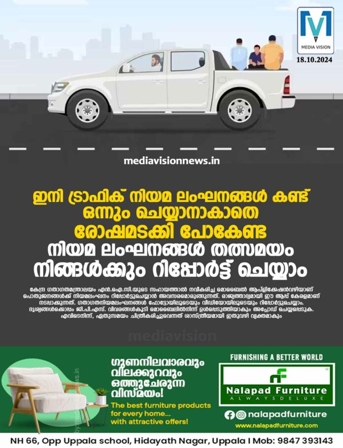 പരാതി രജിസ്റ്റര്ചെയ്യാം എന്ന വിഭാഗത്തിലൂടെയാണ് ദൃശ്യങ്ങള് പകര്ത്തേണ്ടത്. ഒപ്പം വാഹനത്തിന്റെ രജിസ്ട്രേഷന്, നിയമലംഘനത്തിന്റെ രീതി, നിയമലംഘനം നടന്ന സ്ഥലത്തിന്റെ ചെറുകുറിപ്പ്, തീയതി, സമയം, സംസ്ഥാനം എന്നിവ രേഖപ്പെടുത്താമെന്ന് ട്രാന്സ്പോര്ട്ട് കമ്മിഷണര് സി.എച്ച്. നാഗരാജ് ‘മാതൃഭൂമി’യോട് പറഞ്ഞു. വേറെ വിവരണങ്ങള് ചേര്ക്കാനുണ്ടെങ്കില് കമന്റ് ബോക്സും ഉണ്ട്.