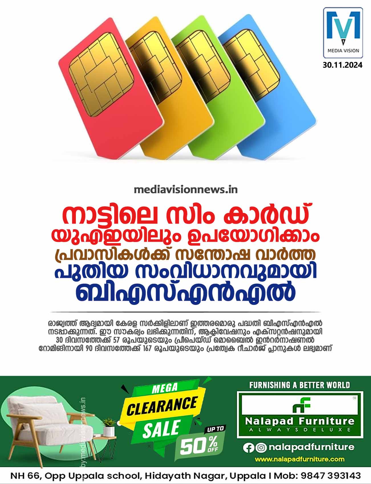 അബുദാബി: നാട്ടില് ഉപയോഗിച്ചു കൊണ്ടിരിക്കുന്ന സിം കാര്ഡ് ഇനി യുഎഇയിലും ഉപയോഗിക്കാം. ബിഎസ്എന്എൽ ഉപഭോക്താക്കള്ക്കാണ് ഈ സൗകര്യം നിലവില് വരുന്നത്. നാട്ടിലെ പ്രീ പെയ്ഡ്, പോസ്റ്റ് പെയ്ഡ് സിം കാര്ഡുകളിൽ പ്രത്യേക റീചാര്ജ് ചെയ്താൽ യുഎഇയിലും ഉപയോഗിക്കാനാകുമെന്ന് ബിഎസ്എൻഎൽ എക്സ് പ്ലാറ്റ്ഫോമില് അറിയിച്ചു.