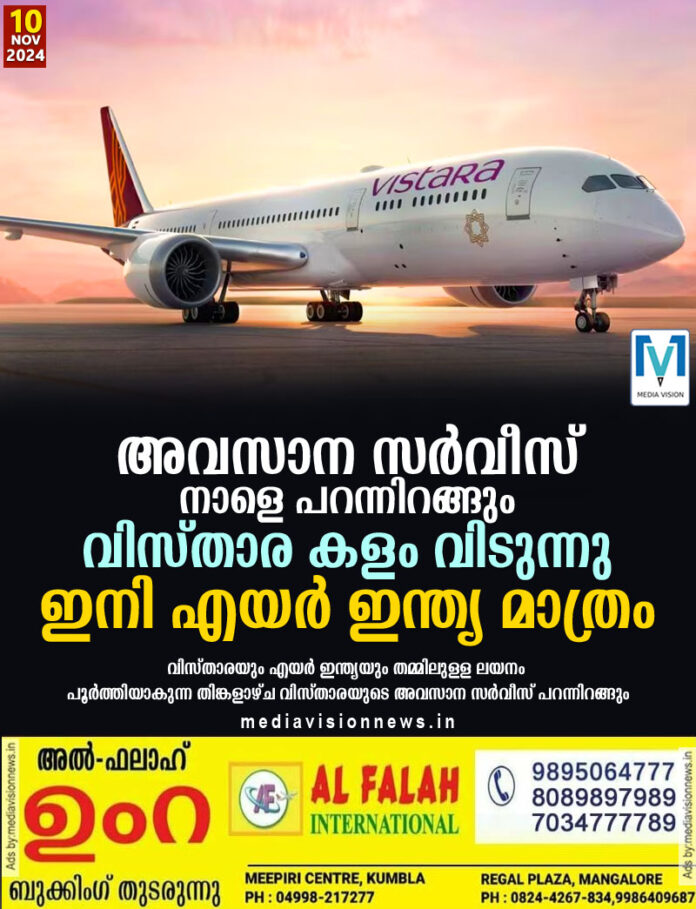 മുംബൈ: ടാറ്റ ഗ്രൂപ്പും സിങ്കപ്പൂർ എയർലൈൻസും ചേർന്നുള്ള ജനപ്രിയ വ്യോമയാന ബ്രാൻഡ് വിസ്താര കളം വിടുന്നു. വിസ്താരയും എയർ ഇന്ത്യയും തമ്മിലുള്ള ലയനം പൂർത്തിയാകുന്ന തിങ്കളാഴ്ച വിസ്താരയുടെ അവസാന സർവീസ് പറന്നിറങ്ങും. ചൊവ്വാഴ്ച മുതൽ ടാറ്റ ഗ്രൂപ്പിനുകീഴിൽ ‘എയർ ഇന്ത്യ’ എന്ന ബ്രാൻഡിൽ മാത്രമാകും സേവനങ്ങൾ ഉണ്ടാകുക.