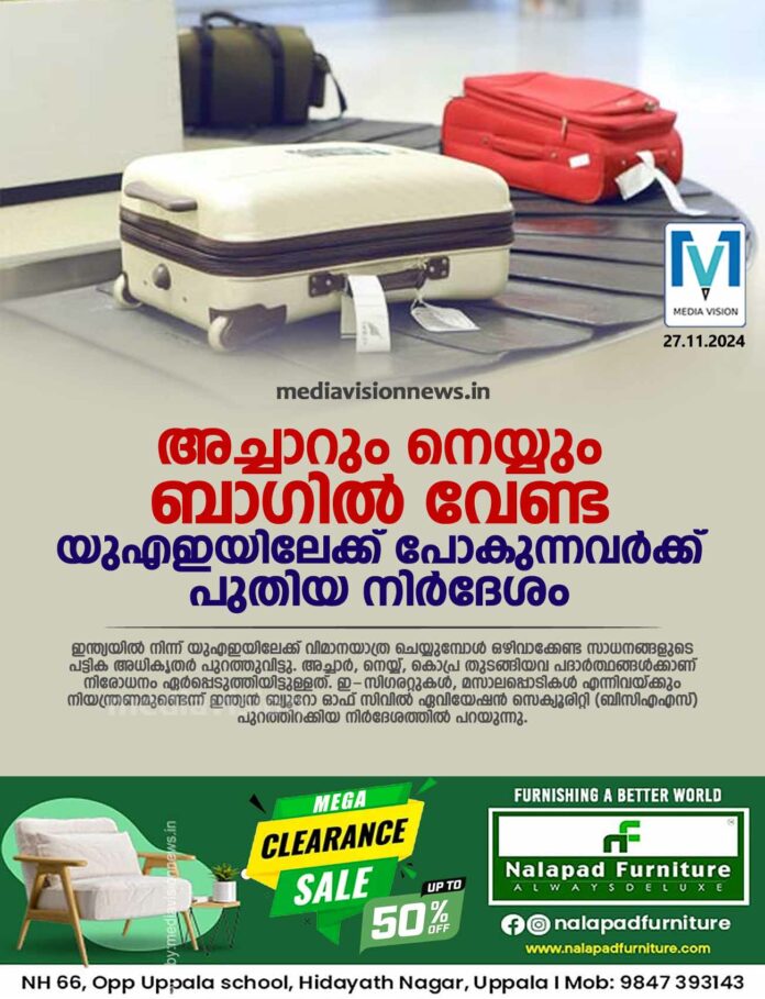 ഇന്ത്യയില് നിന്ന് യുഎഇയിലേക്ക് വിമാനയാത്ര ചെയ്യുമ്പോള് ഒഴിവാക്കേണ്ട സാധനങ്ങളുടെ പട്ടിക അധികൃതര് പുറത്തുവിട്ടു. അച്ചാര്, നെയ്യ്, കൊപ്ര തുടങ്ങിയവ പദാര്ത്ഥങ്ങള്ക്കാണ് നിരോധനം ഏര്പ്പെടുത്തിയിട്ടുള്ളത്. ഇ-സിഗരറ്റുകള്, മസാലപ്പൊടികള് എന്നിവയ്ക്കും നിയന്ത്രണമുണ്ടെന്ന് ഇന്ത്യന് ബ്യൂറോ ഓഫ് സിവില് ഏവിയേഷന് സെക്യൂരിറ്റി (ബിസിഎഎസ്) പുറത്തിറക്കിയ നിര്ദേശത്തില് പറയുന്നു.