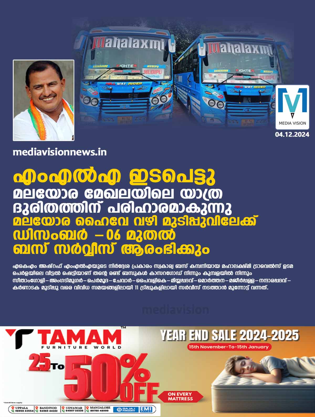 മലയോര ഹൈവേയിൽ സർവ്വീസ് ആരംഭിക്കാൻ കേരള കെഎസ്ആർടിസിയോടും ഗതാഗത വകുപ്പ് മന്ത്രിയോടും പലവട്ടം കത്തിലൂടെയും നേരിട്ടും മഞ്ചേശ്വരം എംഎൽഎ ആവശ്യമുന്നയിച്ചെങ്കിലും ആവശ്യമായ ബസില്ലെന്ന കാരണത്താൽ നിരസിക്കുകയായിരുന്നു. പിന്നീട് കർണാടക കെഎസ്ആർടിസിയോടും ഇതേ ആവശ്യം ഉന്നയിച്ചെങ്കിലും ബസുകൾ അനുവദിച്ചിരുന്നില്ല തുടർന്ന് തന്റെ എംഎൽഎ ഫണ്ടിൽ നിന്നുള്ള തുക ഉപയോഗിച്ച് ഗ്രാമീണ ബസ് അനുവദിക്കാൻ ധനകാര്യ വകുപ്പിന്റെ പ്രത്യേക അനുമതിക്കായി എകെഎം അഷ്റഫ് എംഎൽഎ അപേക്ഷ നൽകിയെങ്കിലും നിരസിക്കപ്പെട്ടതോടെയാണ് ഈ റൂട്ടിൽ ബസുകൾ ഓടിക്കാൻ ആവശ്യപ്പെട്ട് സ്വകാര്യ ബസ് ഓണർമാരോട് എംഎൽ ഉന്നയിച്ചത്. തുടർന്ന് മഹാലക്ഷ്മി ബസ്കമ്പനിയുടെ രണ്ട് ബസുകൾക്ക് മലയോര ഹൈവേ വഴി സർവ്വീസ് നടത്താനുള്ള അനുമതി നൽകുവാൻ റിജ്യീണൽ ട്രാൻസ്പോർട്ട് അതോറിറ്റി ചെയർമാൻ കൂടിയായ ജില്ലാ കളക്ടർക്ക് 2023 സെപ്തംബർ 15 ന് കത്ത് നൽകുകയും തുടർന്ന് ജില്ലാ വികസന സമിതിയിലും മറ്റും എംഎൽഎ നടത്തിയ ഇടപെടലിന്റെ അടിസ്ഥാനത്തിലാണ് മലയോര മേഖലയില പുത്തിഗെ, എന്മകജെ, പൈവളികെ, മീഞ്ച, വോർക്കാടി ഗ്രാമ പഞ്ചായത്തിലെ നിരവധി സാധാരണക്കാർക്ക് ഏറെ ഉപകാരമാകുന്ന റൂട്ടിൽ 2 ബസുകൾ അനുവദിച്ചത്.