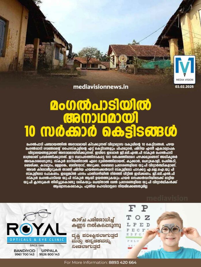 കാസർകോട്: മംഗൽപാടി പഞ്ചായത്തിൽ അനാഥമായി കിടക്കുന്നത് വിദ്യാഭ്യാസ വകുപ്പിന്റെ 10 കെട്ടിടങ്ങൾ. പഴയ മംഗൽപ്പാടി ഗവൺമെന്റ് ഹൈസ്കൂളിന്റെ എട്ട് കെട്ടിടങ്ങളും ചിഹ്നമുഗർ, ഷിറിയ എന്നീ ഏകാധ്യാപക വിദ്യാലയങ്ങളുമാണ് അനാഥമായിരിക്കുന്നത്. ഇവിടെ ഇപ്പോൾ ജി.ബി.എൽ.പി സ്കൂൾ മംഗൽപാടി മാത്രമാണ് പ്രവർത്തിക്കുന്നത്. ഈ സ്ഥാപനത്തിനാകട്ടെ 100 വർഷത്തിലേറെ പഴക്കമുണ്ടെന്ന് അധികൃതർ അവകാശപ്പെടുന്നു.