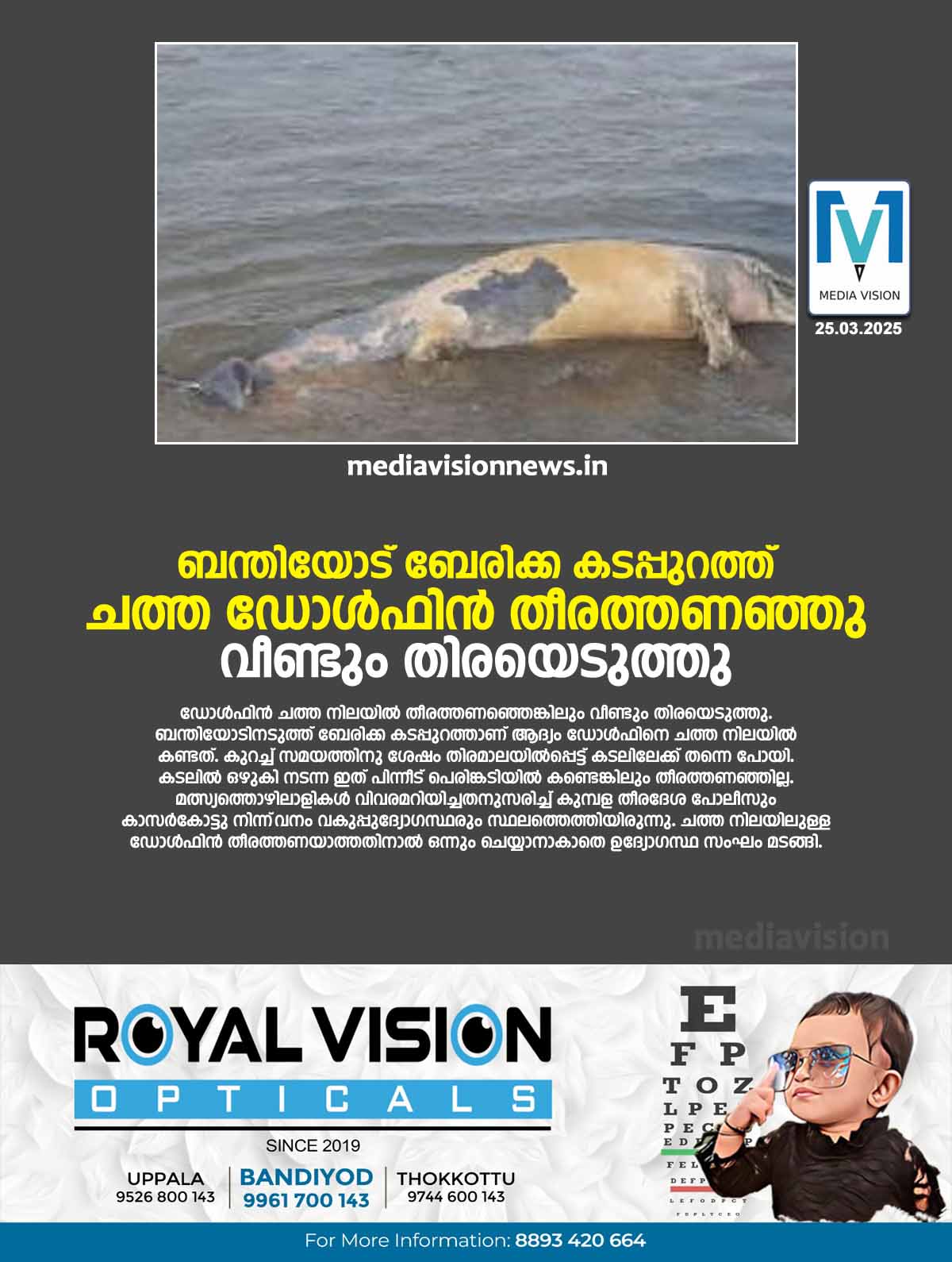 ബന്തിയോട് : ഡോൾഫിൻ ചത്ത നിലയിൽ തീരത്തണഞ്ഞെങ്കിലും വീണ്ടും തിരയെടുത്തു. ബന്തിയോടിനടുത്ത് ബേരിക്ക കടപ്പുറത്താണ് ആദ്യം ഡോൾഫിനെ ചത്ത നിലയിൽ കണ്ടത്. കുറച്ച് സമയത്തിനു ശേഷം തിരമാലയിൽപ്പെട്ട് കടലിലേക്ക് തന്നെ പോയി.