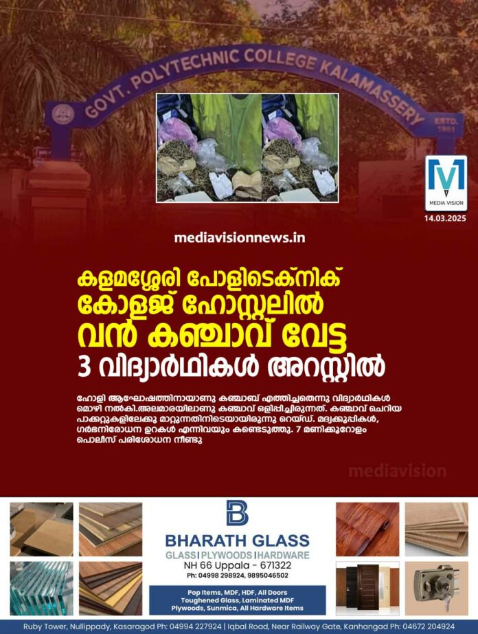കൊച്ചി ∙ കളമശ്ശേരി പോളിടെക്നിക് കോളജിന്റെ മെൻസ് ഹോസ്റ്റലിൽ പൊലീസ് നടത്തിയ മിന്നൽ പരിശോധനയിൽ 2 കിലോ കഞ്ചാവ് പിടകൂടി. 3 വിദ്യാർഥികളെ അറസ്റ്റ് ചെയ്തു. ഹോളി ആഘോഷത്തിനായാണു കഞ്ചാബ് എത്തിച്ചതെന്നു വിദ്യാർഥികൾ മൊഴി നൽകി.