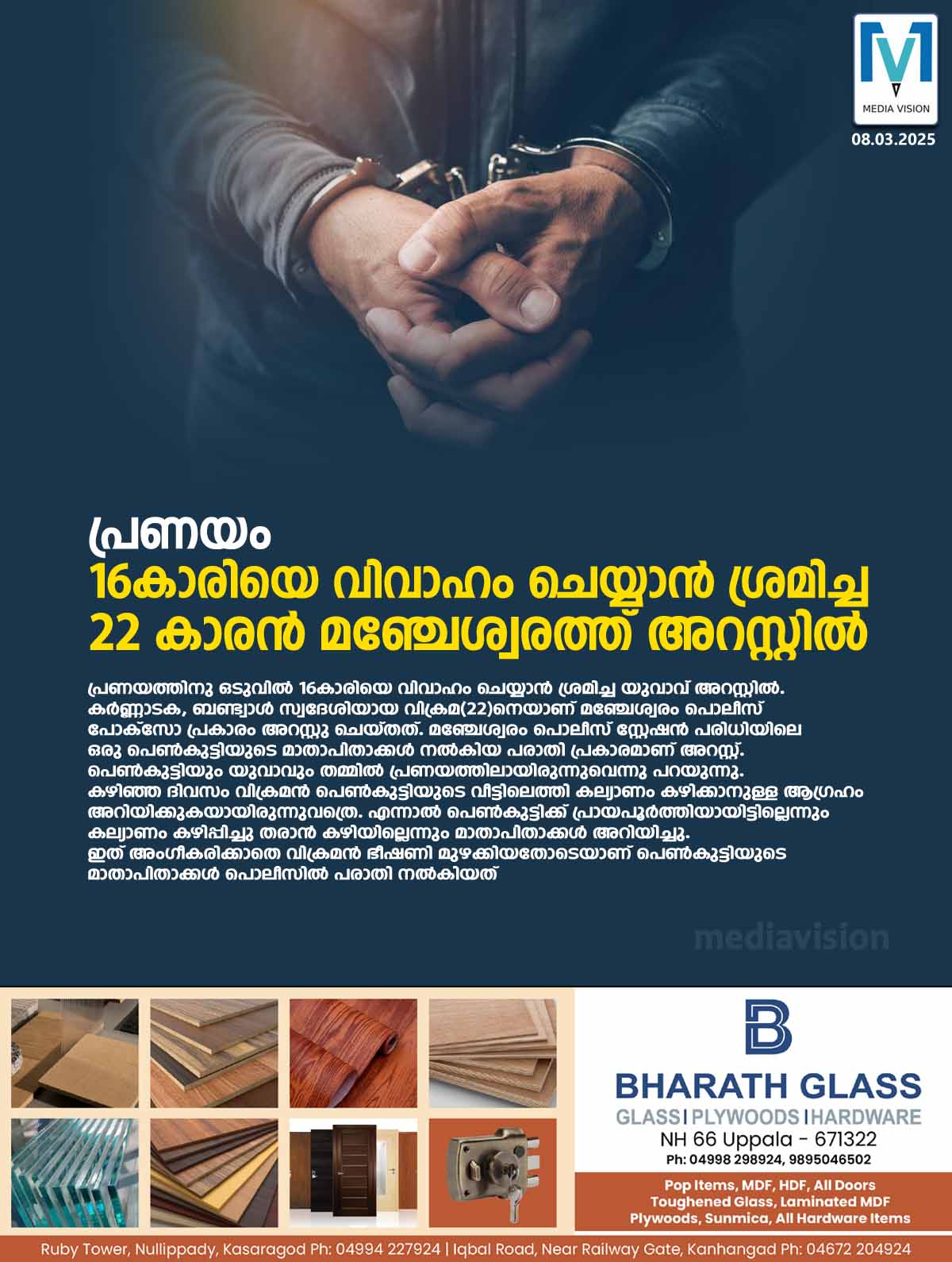 കാസര്കോട്: പ്രണയത്തിനു ഒടുവില് 16കാരിയെ വിവാഹം ചെയ്യാന് ശ്രമിച്ച യുവാവ് അറസ്റ്റില്. കര്ണ്ണാടക, ബണ്ട്വാള് സ്വദേശിയായ വിക്രമ(22)നെയാണ് മഞ്ചേശ്വരം പൊലീസ് പോക്സോ പ്രകാരം അറസ്റ്റു ചെയ്തത്. മഞ്ചേശ്വരം പൊലീസ് സ്റ്റേഷന് പരിധിയിലെ ഒരു പെണ്കുട്ടിയുടെ മാതാപിതാക്കള് നല്കിയ പരാതി പ്രകാരമാണ് അറസ്റ്റ്. പെണ്കുട്ടിയും യുവാവും തമ്മില് പ്രണയത്തിലായിരുന്നുവെന്നു പറയുന്നു. കഴിഞ്ഞ ദിവസം വിക്രമന് പെണ്കുട്ടിയുടെ വീട്ടിലെത്തി കല്യാണം കഴിക്കാനുള്ള ആഗ്രഹം അറിയിക്കുകയായിരുന്നുവത്രെ. എന്നാല് പെണ്കുട്ടിക്ക് പ്രായപൂര്ത്തിയായിട്ടില്ലെന്നും കല്യാണം കഴിപ്പിച്ചു തരാന് കഴിയില്ലെന്നും മാതാപിതാക്കള് അറിയിച്ചു. ഇത് അംഗീകരിക്കാതെ വിക്രമന് ഭീഷണി മുഴക്കിയതോടെയാണ് പെണ്കുട്ടിയുടെ മാതാപിതാക്കള് പൊലീസില് പരാതി നല്കിയത്.
