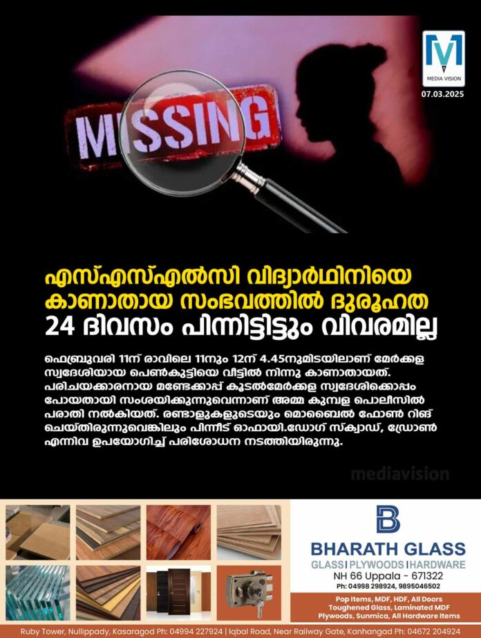 കുമ്പള: കുമ്പളയിലെ പത്താം ക്ലാസ് വിദ്യാർഥിനിയെ കാണാതായ സംഭവത്തിൽ ദുരൂഹത തുടരുന്നു. 24 ദിവസം പിന്നിട്ടിട്ടും കുട്ടിയെകുറിച്ച് വിവരമില്ലാത്തതിൽ ആശങ്കയിലാണ് മാതാപിതാക്കൾ. ഏതാനും ദിവസം മൊബൈൽ ഫോൺ റിങ് ചെയ്തിരുന്നതിനാൽ അധികം താമസിയാതെ മകളെ ബന്ധപ്പെടാൻ സാധിക്കുമെന്ന പ്രതീക്ഷയിലായിരുന്നു കുടുംബം. ഫോൺ പലപ്രാവശ്യം റിങ് ചെയ്ത് ഓഫായതോടെ ആ പ്രതീക്ഷയും അവസാനിച്ചു. മകൾ ഇപ്രാവശ്യം എസ്എസ്എൽസി പരീക്ഷ എഴുതേണ്ടതായിരുന്നു.