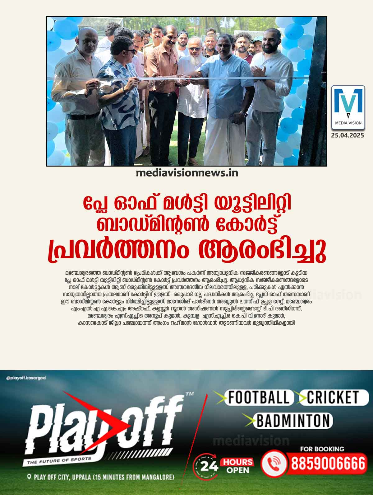 ഉപ്പള: മഞ്ചേശ്വരത്തെ ബാഡ്മിന്റണ് പ്രേമികള്ക്ക് ആവേശം പകര്ന്ന് അത്യാധുനിക സജ്ജീകരണങ്ങളോട് കൂടിയ പ്ലേ ഓഫ് മൾട്ടി യൂട്ടിലിറ്റി ബാഡ്മിന്റൺ കോർട്ട് പ്രവർത്തനം ആരംഭിച്ചു. ആധുനിക സജ്ജീകരണങ്ങളോടെ നാല് കോര്ട്ടുകള് ആണ് ഒരുക്കിയിട്ടുള്ളത്. അന്തര്ദേശീയ നിലവാരത്തിലുള്ള, പരിക്കുകള് ഏല്ക്കാന് സാധ്യതയില്ലാത്ത പ്രതലമാണ് കോര്ട്ടിന് ഉള്ളത്. ഒരുപാട് നല്ല പദ്ധതികൾ ആരംഭിച്ച പ്ലേയ് ഓഫ് തന്നെയാണ് ഈ ബാഡ്മിൻ്റൺ കോർട്ടും നിർമ്മിച്ചിട്ടുള്ളത്. മാനേജിങ് പാർട്ണർ അബ്ദുൽ ലത്തീഫ് ഉപ്പള ഗേറ്റ്, മഞ്ചേശ്വരം എം.എൽ.എ എ.കെ.എം അഷ്റഫ്, കണ്ണൂർ റൂറൽ അഡിഷണൽ സുപ്പീരിന്റെണ്ടെന്റ് ടി.പി രഞ്ജിത്ത്, മഞ്ചേശ്വരം എസ്.എച്ച്.ഒ അനൂപ് കുമാർ, കുമ്പള എസ്.എച്ച്.ഒ കെ.പി വിനോദ് കുമാർ, കാസറകോട് ജില്ലാ പഞ്ചായത്ത് അംഗം റഹ്മാൻ ഗോൾഡൻ തുടങ്ങിയവർ മുഖ്യാതിഥികളായി