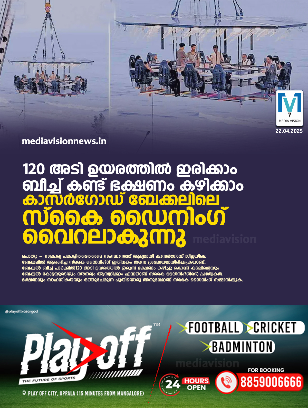 120 അടി ഉയരത്തിൽ ഇരിക്കാം, ബീച്ച് കണ്ട് ഭക്ഷണം കഴിക്കാം; കാസർഗോഡ് ബേക്കലിലെ സ്കൈ ഡൈനിംഗ് വൈറലാകുന്നു