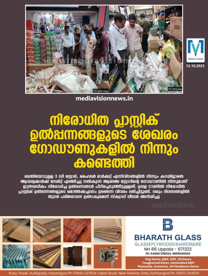 നിരോധിത പ്ലാസ്റ്റിക് ഉൽപ്പന്നങ്ങളുടെ ശേഖരം ഗോഡൗണുകളിൽ നിന്നും കണ്ടെത്തി