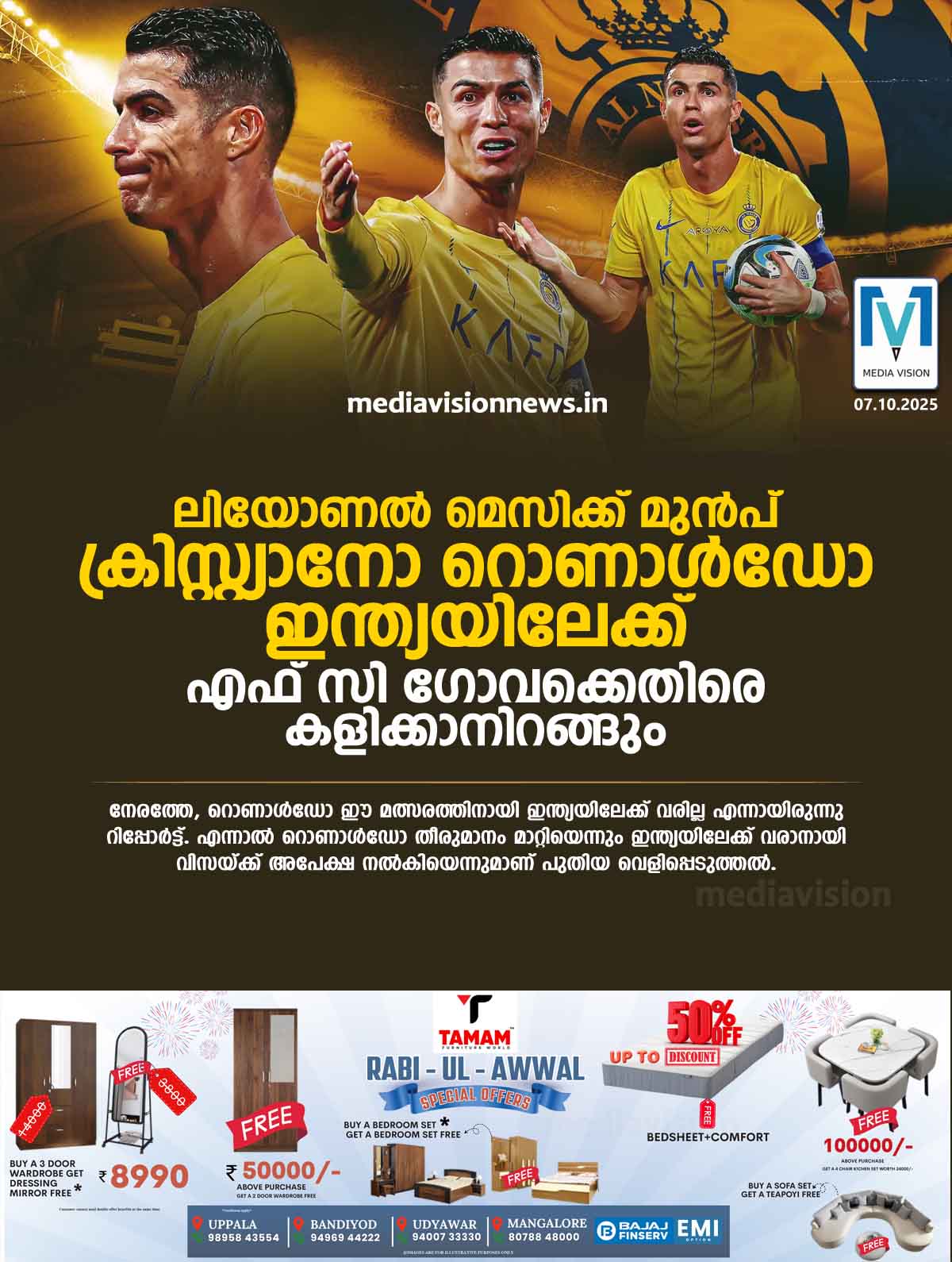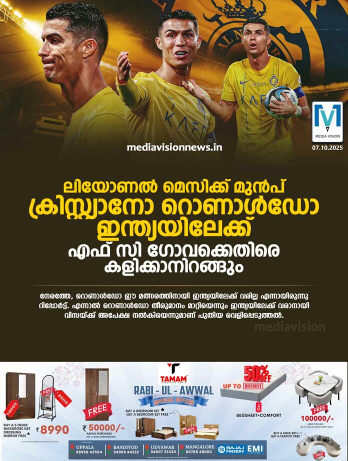 ലിയോണൽ മെസിക്ക് മുൻപ് ക്രിസ്റ്റ്യാനോ റൊണാൾഡോ ഇന്ത്യയിലേക്ക്, എഫ് സി ഗോവക്കെതിരെ കളിക്കാനിറങ്ങും