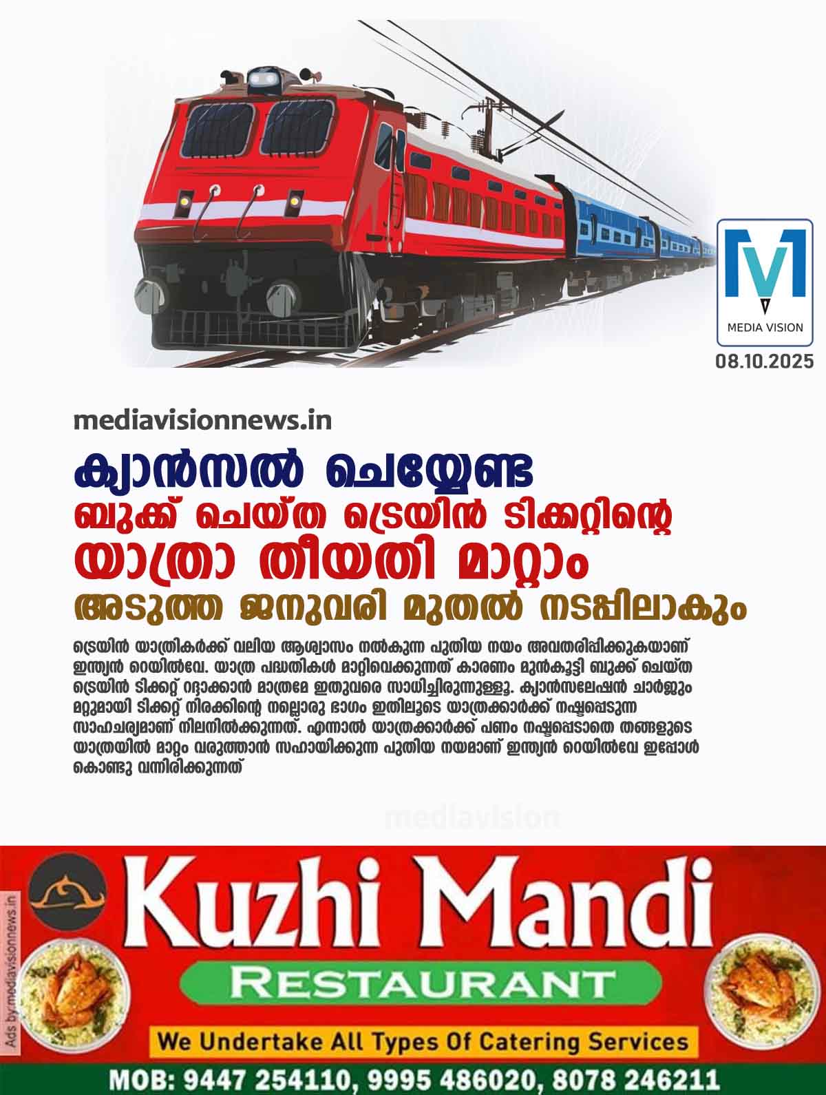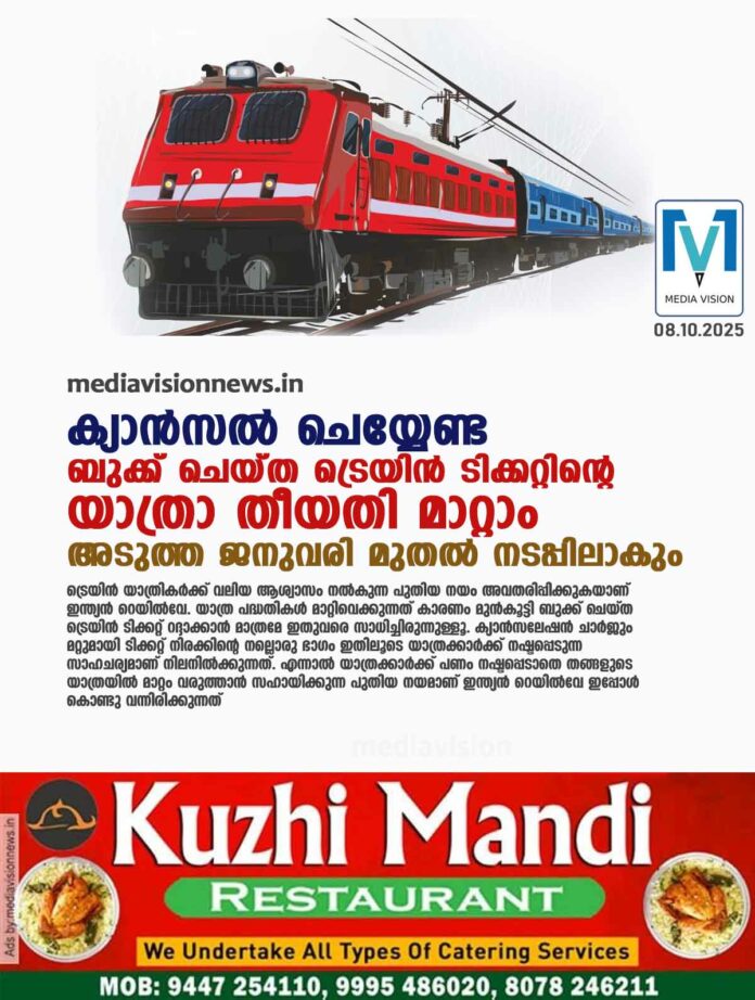 ട്രെയിന് ടിക്കറ്റുകളിലെ യാത്രാ തീയതി അധിക ചാർജ് കൊടുക്കാതെ തന്നെ ഓണ്ലൈനായി മാറ്റാന് യാത്രക്കാര്ക്ക് സാധിക്കുമെന്ന് റെയില്വേ മന്ത്രി അശ്വിനി വൈഷ്ണവിനെ ഉദ്ധരിച്ച് എന്ഡിടിവി റിപ്പോര്ട്ട് ചെയ്യുന്നു. അടുത്ത വര്ഷം ജനുവരി മുതല് ഈ പദ്ധതി പ്രാബല്യത്തില്വരും.