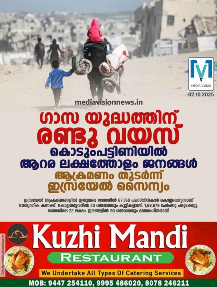 ജറുസലം ∙ മധ്യപൂർവദേശത്തെ ഏറ്റവും രക്തരൂക്ഷിത അധ്യായമായി മാറിയ ഗാസ യുദ്ധത്തിന് ഇന്ന് രണ്ടു വയസ്. ഇസ്രയേൽ ആക്രമണങ്ങളിൽ ഇതുവരെ ഗാസയിൽ 67,160 പലസ്തീൻകാർ കൊല്ലപ്പെട്ടെന്നാണ് ഔദ്യോഗിക കണക്ക്. കൊല്ലപ്പെട്ടവരിൽ 30 ശതമാനവും കുട്ടികളാണ്. 1,69,679 പേർക്കു പരുക്കേറ്റു. ഗാസയിലെ 22 ലക്ഷം ജനങ്ങളിൽ 90 ശതമാനവും ഭവനരഹിതരായി. ആറര ലക്ഷത്തോളം ആളുകൾ കൊടുംപട്ടിണിയിലായി. യുദ്ധം രൂക്ഷമായതിനെ തുടർന്ന് ഗാസയിലെ ആരോഗ്യകേന്ദ്രങ്ങളും ആശുപത്രി സംവിധാനങ്ങളും തകർന്നടിഞ്ഞതിനാൽ പലസ്തീൻ അധികൃതർ നൽകുന്ന കണക്ക് യഥാർഥ മരണസംഖ്യയെക്കാൾ കുറവാണെന്നാണ് റിപ്പോർട്ടുകൾ.