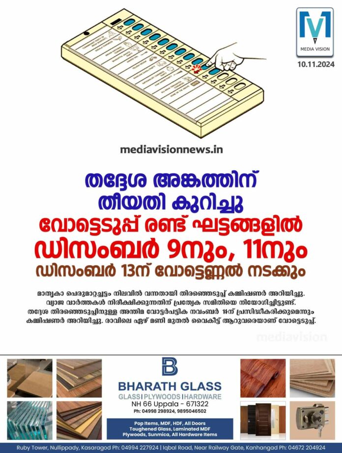തദ്ദേശ അങ്കത്തിന് തീയതി കുറിച്ചു; വോട്ടെടുപ്പ് രണ്ട് ഘട്ടങ്ങളില്‍, ഡിസംബര്‍ 9നും, 11നും