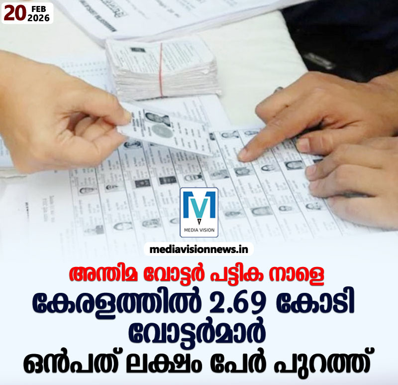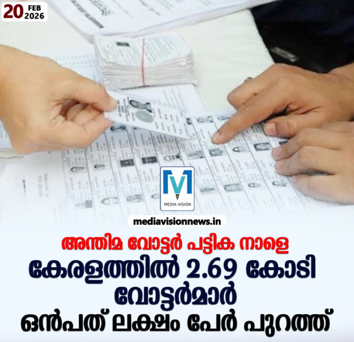 തിരുവനന്തപുരം:സംസ്ഥാനത്ത് തീവ്ര വോട്ടര്‍ പട്ടിക പരിഷ്കരണത്തിന് ശേഷമുള്ള അന്തിമ പട്ടികയിൽ 2.69 കോടി വോട്ടര്‍മാര്‍. അന്തിമ വോട്ടര്‍ പട്ടിക നാളെ പ്രസിദ്ധീകരിക്കും. എസ്ഐആറിന് മുന്‍പുള്ള പട്ടികയിൽ നിന്ന് ഒന്‍പത് ലക്ഷത്തോളം പേരുടെ കുറവാണുള്ളത്. ഡിസംബര്‍ 23 പ്രസിദ്ധീകരിച്ച കരട് പട്ടികയിലുണ്ടായിരുന്ന 53,229 പേരെ ഹിയറിങ് കാലയളവയിൽ ഒഴിവാക്കി. മരിച്ചവരെയും , വിദേശ പൗരത്വം നേടിയവരെയും താമസം മാറിയവരെയുമാണ് ഒഴിവാക്കിയത്. എസ്ഐആര്‍ കാലയളവിൽ പേരുചേര്‍ക്കാൻ കിട്ടിയ അപേക്ഷയിൽ 13.51 ലക്ഷം അംഗീകരിച്ചു.