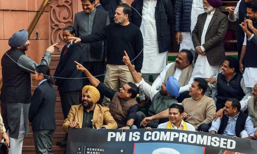 ബുധനാഴ്ച പാർലമെന്റ് സെഷൻ തുടങ്ങുന്നതിന് മുമ്പായിരുന്നു കവാടത്തിലെ നാടകീയ രംഗങ്ങൾ. കഴിഞ്ഞ ദിവസം പാർലമെന്റിലെ സംഭവ വികാസങ്ങളുടെ പേരിൽ സ്പീക്കർ സസ്പെൻഡ് ചെയ്ത ഹൈബി ഈഡൻ, ഡീൻ കുര്യാകോസ് ഉൾപ്പെടെ എട്ട് എം.പിമാർ സഭാ കവാടത്തിൽ പ്രതിഷേധ ധർണ നടത്തുന്ന സ്ഥലത്ത് എത്തിയതായിരുന്നു രാഹുൽ. അവരെ അഭിവാദ്യം ചെയ്ത് നിൽക്കുന്നതിനിടെയാണ് കേന്ദ്ര റെയിൽവേ സഹമന്ത്രി രവ്നീത് സിങ് ബിട്ടു നടന്നു വന്നത്. ഹസ്തദാനത്തിനായി രാഹുൽ കൈ നീട്ടിയപ്പോൾ നിരസിച്ച ബിട്ടു, രാജ്യത്തിന്റെ ശത്രുക്കൾ എന്ന് വിളിച്ചാണ് തുടങ്ങിയത്. ധർണ നടത്തിയ എം.പിമാരെ നോക്കി ‘യുദ്ധം ജയിച്ചവരെ പോലെ ഇരിക്കുന്നു’ എന്നും പറഞ്ഞു.