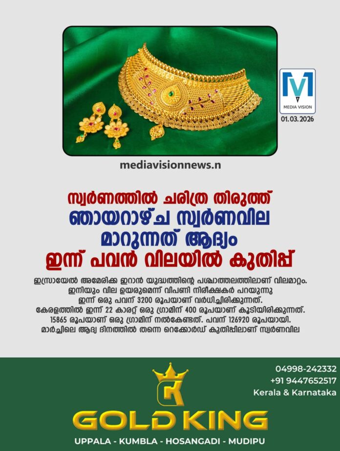 കേരളത്തില്‍ ഇന്ന് 22 കാരറ്റ് ഒരു ഗ്രാമിന് 400 രൂപയാണ് കൂടിയിരിക്കുന്നത്. 15865 രൂപയാണ് ഒരു ഗ്രാമിന് നല്‍കേണ്ടത്. പവന് 126920 രൂപയായി. മാര്‍ച്ചിലെ ആദ്യ ദിനത്തില്‍ തന്നെ റെക്കോര്‍ഡ് കുതിപ്പിലാണ് സ്വര്‍ണവില. വെള്ളി വിലയിലും ഇന്ന് വന്‍ മുന്നേറ്റമാണ്. കേരളത്തില്‍ ഒരു ഗ്രാം വെള്ളിക്ക് 310 രൂപയാണ് വില. പത്ത് ഗ്രാമിന് 3100 രൂപയും.