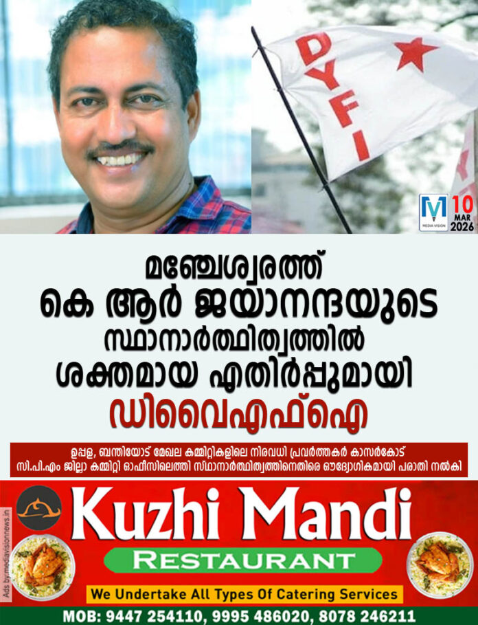 കാസർകോട്: മഞ്ചേശ്വരം നിയമസഭാ മണ്ഡലത്തിൽ സി.പി.എം സ്ഥാനാർത്ഥിയായി ജില്ലാ സെക്രട്ടേറിയറ്റ് അംഗം കെ.ആർ. ജയാനന്ദയെ നിശ്ചയിച്ചതിനെതിരെ പാർട്ടിക്കുള്ളിൽ ഭിന്നത രൂക്ഷമാകുന്നു. സ്ഥാനാർത്ഥിത്വ പ്രഖ്യാപനത്തിന് പിന്നാലെ ഡിവൈഎഫ്ഐയിലെ വിവിധ മേഖല കമ്മിറ്റികൾ പ്രതിഷേധവുമായി രംഗത്തെത്തി. ഉപ്പള, ബന്തിയോട് മേഖല കമ്മിറ്റികളിലെ നിരവധി പ്രവർത്തകർ കാസർകോട് സി.പി.എം ജില്ലാ കമ്മിറ്റി ഓഫീസിലെത്തി സ്ഥാനാർത്ഥിത്വത്തിനെതിരെ ഔദ്യോഗികമായി പരാതി നൽകി.