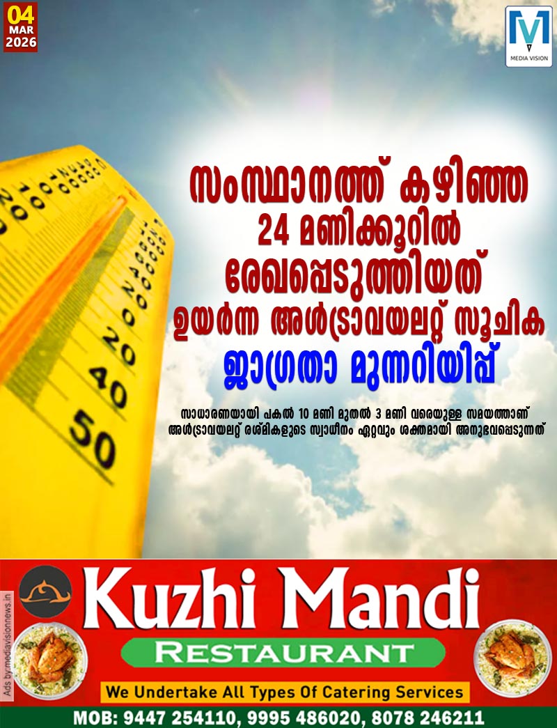 തിരുവനന്തപുരം: കേരളത്തിൽ കഴിഞ്ഞ 24 മണിക്കൂറിനിടെ അതീവ ഗുരുതരമായ രീതിയിൽ അൾട്രാവയലറ്റ് സൂചിക രേഖപ്പെടുത്തിയതായി സംസ്ഥാന ദുരന്ത നിവാരണ അതോറിറ്റി മുന്നറിയിപ്പ് നൽകി. സൂര്യനിൽ നിന്നുള്ള അൾട്രാവയലറ്റ് രശ്മികൾ തുടർച്ചയായി ശരീരത്തിൽ ഏൽക്കുന്നത് സൂര്യാതപം, ഗുരുതരമായ ത്വക്ക് രോഗങ്ങൾ, നേത്രരോഗങ്ങൾ എന്നിവയ്ക്ക് കാരണമാകുമെന്നതിനാൽ പൊതുജനങ്ങൾ കർശനമായ സുരക്ഷാ മുൻകരുതലുകൾ സ്വീകരിക്കണമെന്ന് അധികൃതർ നിർദ്ദേശിക്കുന്നു.
