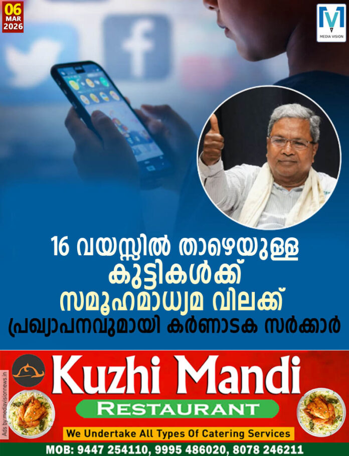 ബെംഗളൂരു : 16 വയസിന് താഴെയുള്ള കുട്ടികള് സോഷ്യല് മീഡിയ ഉപയോഗിക്കുന്നത് നിരോധിച്ച് കര്ണാടക സർക്കാർ. സംസ്ഥാനത്തെ ബജറ്റ് സമ്മേളനത്തിനിടെയാണ് പ്രഖ്യാപനം. കുട്ടികൾക്കിടയിൽ വര്ധിച്ച് വരുന്ന മൊബൈൽ ഫോണുകളുടെ ഉപയോഗം പ്രത്യാഘാതങ്ങൾക്ക് കാരണമാകുന്നുണ്ടെന്നും ഇത് തടയിടാനാണ് സര്ക്കാര് ഇത്തരമൊരു നടപടിയെന്നും അദ്ദേഹം വ്യക്തമാക്കി.
