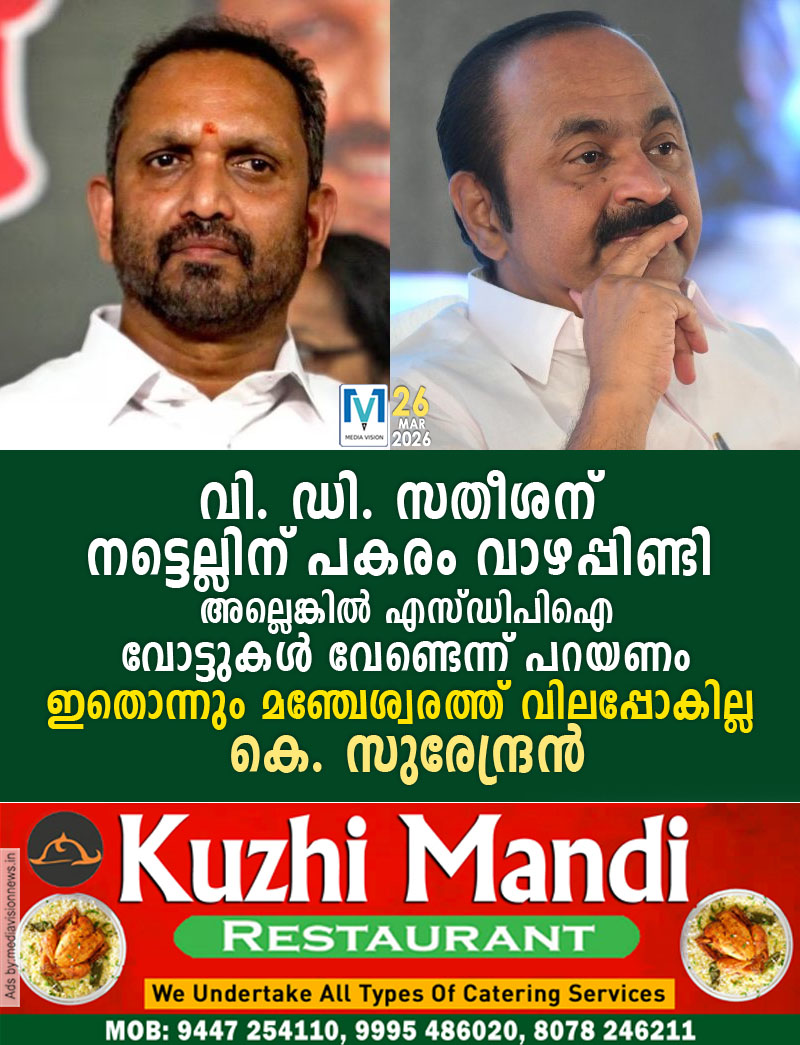 ‘വി ഡി സതീശനും കുഞ്ഞാലിക്കുട്ടിയും അടക്കമുള്ളവര്‍ ഇടപെട്ടാണ് കെ എം അഷ്‌റഫിന്റെ പത്രിക പിന്‍വലിപ്പിച്ചത്. മുസ്‌ലിം സംഘടനകളെ ഉപയോഗിച്ചാണ് സമ്മര്‍ദം ചെലുത്തിയത്. വി ഡി സതീശന് നട്ടെല്ലിന് പകരം വാഴപ്പിണ്ടി അല്ലെങ്കില്‍ SDPI വോട്ടുകള്‍ വേണ്ടെന്ന് പറയണം. ഇതൊന്നും മഞ്ചേശ്വരത്ത് വിലപ്പോകില്ല,’ കെ സുരേന്ദ്രന്‍ പറഞ്ഞു.