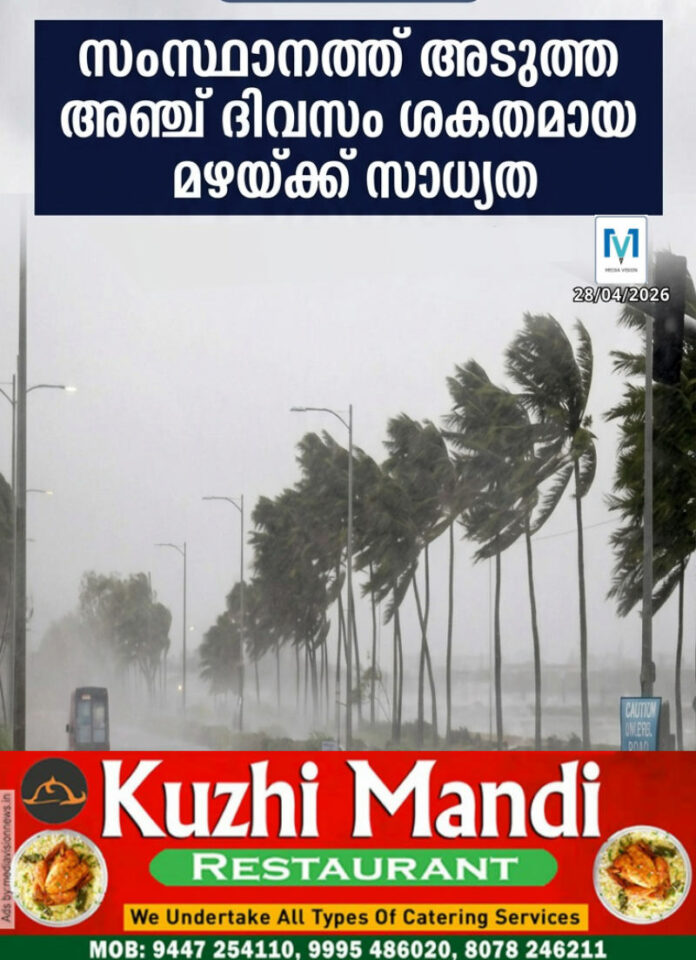 തിരുവനന്തപുരം: സംസ്ഥാനത്ത് അടുത്ത അഞ്ച് ദിവസം ഒറ്റപ്പെട്ട ശക്തമായ മഴയ്ക്ക് സാധ്യതയുള്ളതായി കേന്ദ്ര കാലാവസ്ഥാ വകുപ്പ് അറിയിച്ചു. വിവിധ ജില്ലകളിൽ വരും ദിവസങ്ങളിൽ മഞ്ഞ അലർട്ട് പ്രഖ്യാപിച്ചിട്ടുണ്ട്. 30ന് കണ്ണൂർ, കാസർഗോഡ്, 1ന് പത്തനംതിട്ട, ഇടുക്കി, വയനാട്, 2ന് ആലപ്പുഴ, കോട്ടയം, എറണാകുളം എന്നീ ജില്ലകളിലാണ് മഞ്ഞ അലർട്ട് പ്രഖ്യാപിച്ചിട്ടുള്ളത്.