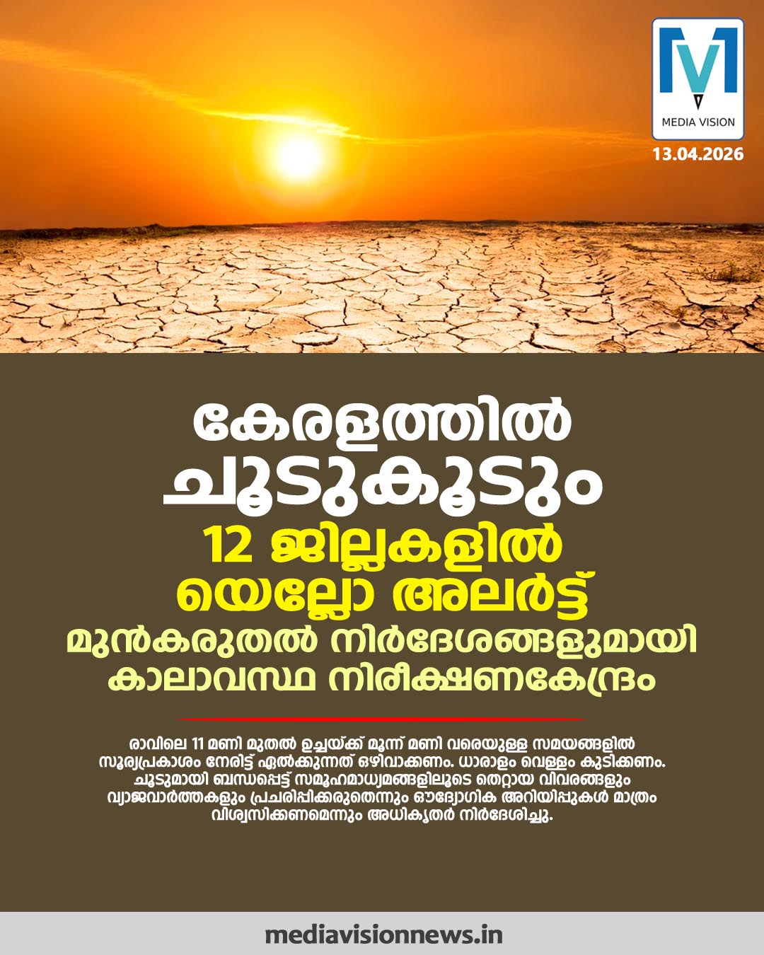 കേരളത്തിൽ ചൂടുകൂടും; 12 ജില്ലകളിൽ യെല്ലോ അലർട്ട്, മുൻകരുതൽ നിർദേശങ്ങളുമായി കാലാവസ്ഥ നിരീക്ഷണകേന്ദ്രം
