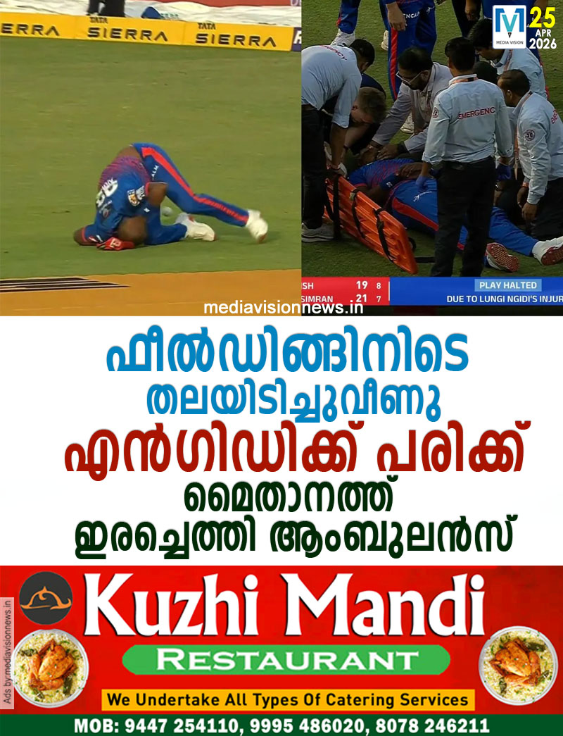 എന്ഗിഡിക്ക് പരിക്കേറ്റതോടെ ഏകദേശം 15 മിനിറ്റിലധികം സമയം മത്സരം നിർത്തിവെച്ചു. മെഡിക്കൽ ടീമിന്റെ പരിചരണത്തിനിടെ എൻഗിഡി പ്രതികരിക്കുന്നുണ്ടെന്നത് നേരിയ ആശ്വാസം നൽകുന്നുണ്ടെങ്കിലും പരിക്കിന്റെ വ്യാപ്തി വ്യക്തമല്ല. താരത്തെ കൂടുതൽ പരിശോധനകൾക്കായി ആശുപത്രിയിലേക്ക് മാറ്റി. ആദ്യം ബാറ്റ് ചെയ്ത ഡല്ഹി രാഹുലിന്റെ റെക്കോര്ഡ് സെഞ്ചുറിയുടെ കരുത്തില് 264 റണ്സടിച്ചെങ്കിലും തിരിച്ചടിച്ച പഞ്ചാബ് പവര് പ്ലേയില് ആറോവറില് വിക്കറ്റ് നഷ്ടമില്ലാതെ 116 റണ്സടിച്ചു. മിന്നും ഫോമിലായിരുന്ന എന്ഗിഡി പരിക്കേറ്റ് പുറത്തായത് ഡല്ഹിക്ക് കനത്ത തിരിച്ചടിയാകും.