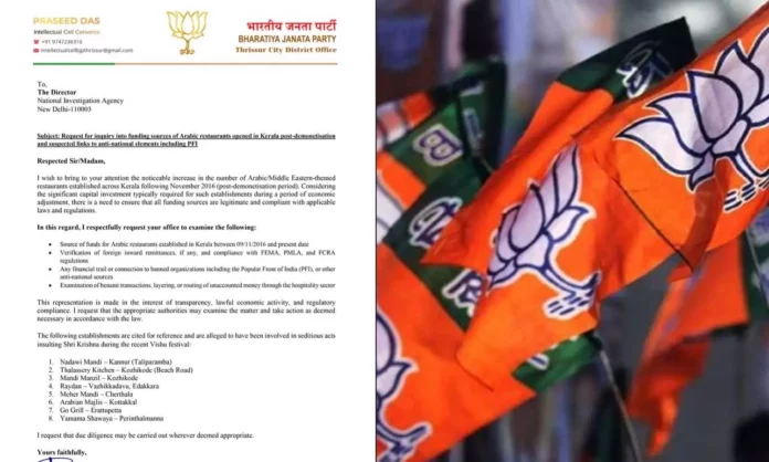 തൃശൂർ: കേരളത്തിൽ കച്ചവടം നടത്തുന്ന അറബിക് റെസ്റ്റോറന്റുകളുടെ സാമ്പത്തിക സ്രോതസ്സുകളെക്കുറിച്ച് ദേശീയ അന്വേഷണ ഏജൻസി (എൻഐഎ) അന്വേഷണം നടത്തണമെന്ന് ബിജെപി. ബിജെപി തൃശൂർ ജില്ലാ ഇന്റലക്ച്വൽ സെൽ കൺവീനർ പ്രസീദ് ദാസാണ് ഇത് സംബന്ധിച്ച് എൻഐഎ ഡയറക്ടർക്ക് പരാതി നൽകിയത്. ഈ സ്ഥാപനങ്ങൾക്ക് രാജ്യവിരുദ്ധ ബന്ധമുണ്ടോ എന്ന് പരിശോധിക്കണമെന്നും പരാതിയിൽ ആവശ്യപ്പെടുന്നു.