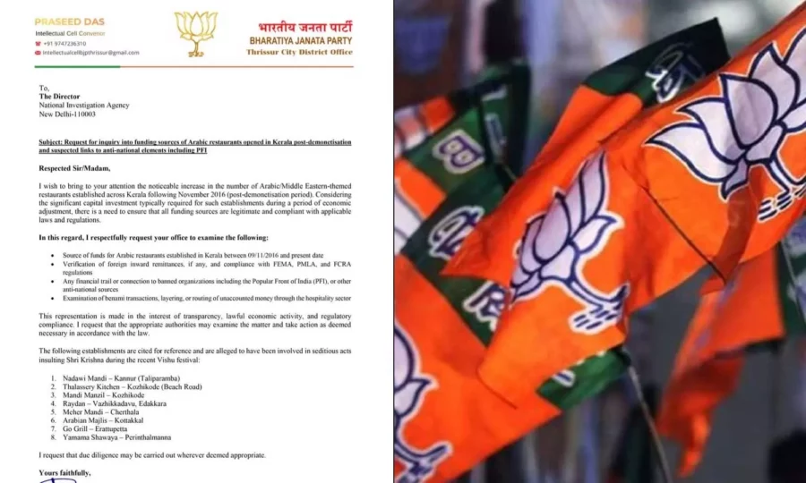 അറബിക് റെസ്റ്റോറന്റുകളുടെ മറവിൽ കള്ളപ്പണം വെളുപ്പിക്കുന്നുണ്ടോ എന്ന കാര്യത്തിലും അന്വേഷണം വേണമെന്നാണ് ബിജെപിയുടെ നിലപാട്. എൻഐഎക്ക് പുറമെ മറ്റ് കേന്ദ്ര ഏജൻസികളുടെ ശ്രദ്ധയിലേക്കും ഈ വിഷയം എത്തിക്കാനാണ് ബിജെപി നീക്കം.
