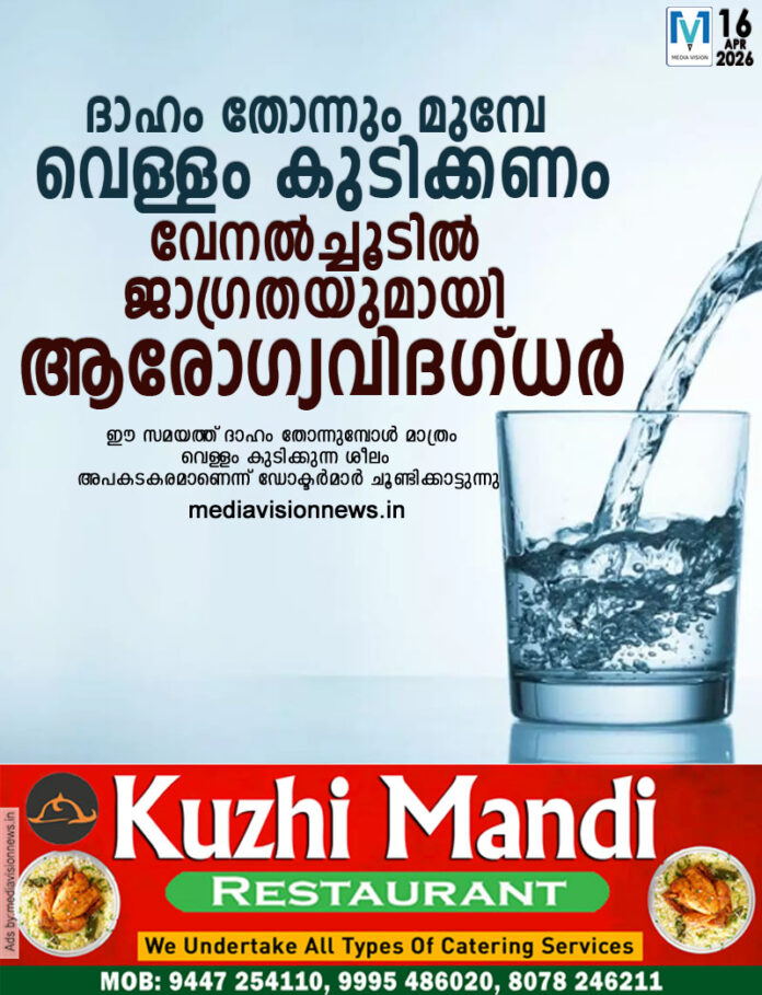 ഉച്ചക്ക് 12 മണി മുതൽ 4 മണി വരെ നേരിട്ട് വെയിൽ ഏൽക്കുന്നത് ഒഴിവാക്കുക. വായുസഞ്ചാരമുള്ള കോട്ടൺ വസ്ത്രങ്ങൾ ധരിക്കുക. കാലാവസ്ഥാ വ്യതിയാനം കടുക്കുന്ന ഈ കാലഘട്ടത്തിൽ, നിർജ്ജലീകരണത്തെ പ്രതിരോധിക്കുക എന്നത് ആരോഗ്യസംരക്ഷണത്തിനപ്പുറം ഒരു അതിജീവന മാർഗം കൂടിയാണെന്ന് വിദഗ്ധർ ഓർമിപ്പിക്കുന്നു.